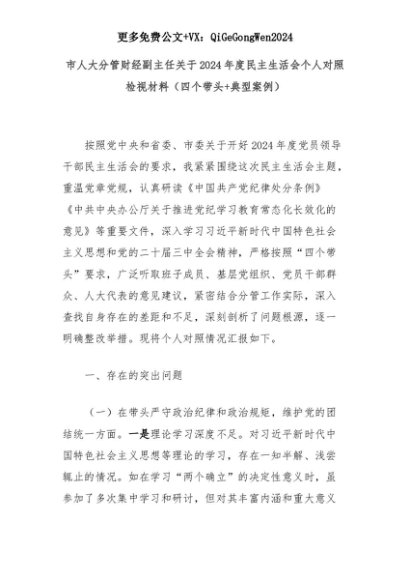 【七哥公文】2025年:市人大分管财经副主任关于2024年度民主生活会个人对照检视材料(四个带头+典型案例)+更多免费公文+VX:QiGeGongWen2024+更多免费公文+VX:QiGeGongWen2024