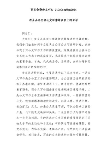 【七哥公文】2025年:在全县办公室公文写作培训班上的讲话+更多免费公文+VX:QiGeGongWen2024+更多免费公文+VX:QiGeGongWen2024
