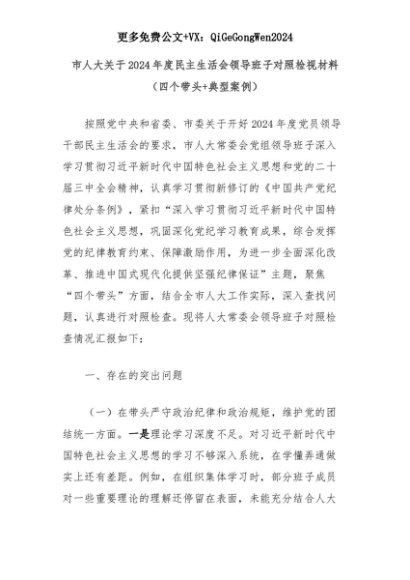 【七哥公文】2025年:市人大关于2024年度民主生活会领导班子对照检视材料(四个带头+典型案例)+更多免费公文+VX:QiGeGongWen2024+更多免费公文+VX:QiGeGongWen2024