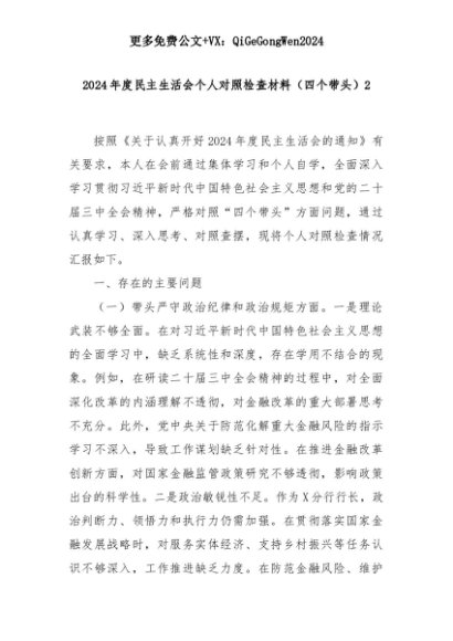 【七哥公文】2025年:2024年度民主生活会个人对照检查材料(四个带头)2+更多免费公文+VX:QiGeGongWen2024+更多免费公文+VX:QiGeGongWen2024