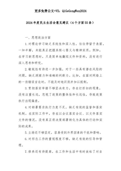【七哥公文】2025年:2024年度民主生活会意见建议(4个方面55条)+更多免费公文+VX:QiGeGongWen2024+更多免费公文+VX:QiGeGongWen2024