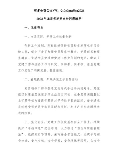 【七哥公文】2025年:2022年基层党建亮点和问题清单+更多免费公文+VX:QiGeGongWen2024+更多免费公文+VX:QiGeGongWen2024