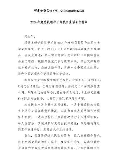 【七哥公文】2025年:2024年度党员领导干部民主生活会主持词+更多免费公文+VX:QiGeGongWen2024+更多免费公文+VX:QiGeGongWen2024