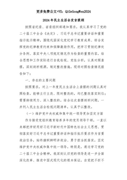 【七哥公文】2025年:2024年民主生活会发言提纲+更多免费公文+VX:QiGeGongWen2024+更多免费公文+VX:QiGeGongWen2024