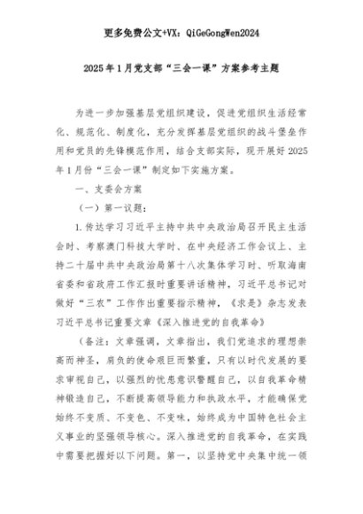 【七哥公文】2025年:2025年1月党支部“三会一课”方案参考主题+更多免费公文+VX:QiGeGongWen2024+更多免费公文+VX:QiGeGongWen2024