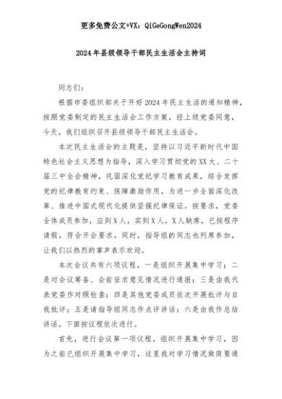 【七哥公文】2025年:2024年县级领导干部民主生活会主持词+更多免费公文+VX:QiGeGongWen2024+更多免费公文+VX:QiGeGongWen2024