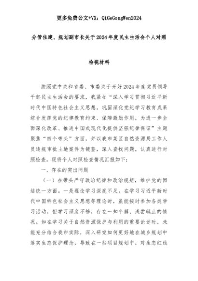 【七哥公文】2025年:分管住建、规划副市长关于2024年度民主生活会个人对照检视材料+更多免费公文+VX:QiGeGongWen2024+更多免费公文+VX:QiGeGongWen2024