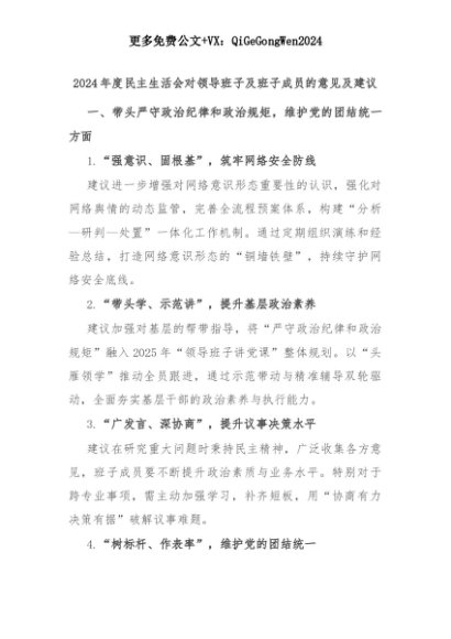 【七哥公文】2025年:2024年度民主生活会对领导班子及班子成员的意见及建议+更多免费公文+VX:QiGeGongWen2024+更多免费公文+VX:QiGeGongWen2024