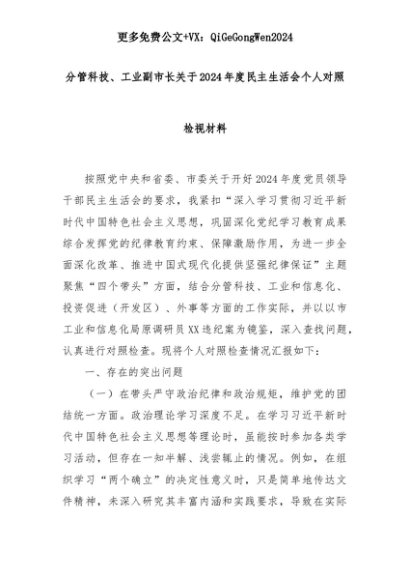【七哥公文】2025年:分管科技、工业副市长关于2024年度民主生活会个人对照检视材料+更多免费公文+VX:QiGeGongWen2024+更多免费公文+VX:QiGeGongWen2024