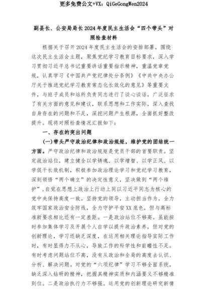 【七哥公文】2025年:副县长、公安局局长2024年度民主生活会“四个带头”对照检查材料+更多免费公文+VX:QiGeGongWen2024+更多免费公文+VX:QiGeGongWen2024