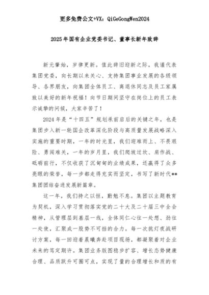 【七哥公文】2025年:2025年国有企业党委书记、董事长新年致辞+更多免费公文+VX:QiGeGongWen2024+更多免费公文+VX:QiGeGongWen2024