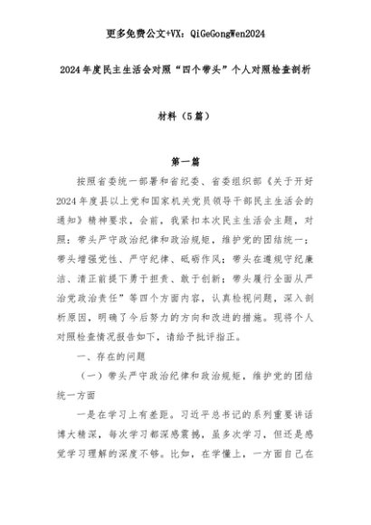 【七哥公文】2025年:(5篇)2024 年度民主生活会对照 “四个带头” 个人对照检查剖析材料+更多免费公文+VX:QiGeGongWen2024+更多免费公文+VX:QiGeGongWen2024