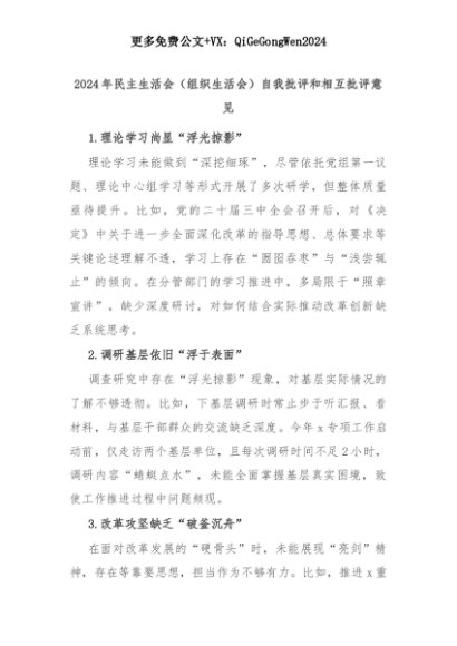 【七哥公文】2025年:2024年民主生活会(组织生活会)自我批评和相互批评意见+更多免费公文+VX:QiGeGongWen2024+更多免费公文+VX:QiGeGongWen2024