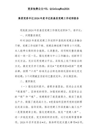 【七哥公文】2025年:集团党委书记2024年度书记抓基层党建工作述职报告+更多免费公文+VX:QiGeGongWen2024+更多免费公文+VX:QiGeGongWen2024