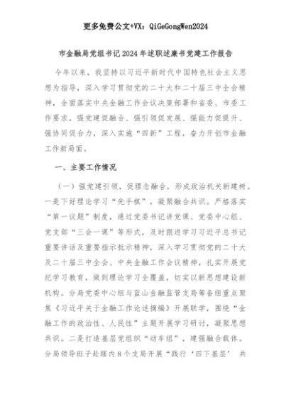 【七哥公文】2025年:市金融局党组书记2024年述职述廉书党建工作报告+更多免费公文+VX:QiGeGongWen2024+更多免费公文+VX:QiGeGongWen2024
