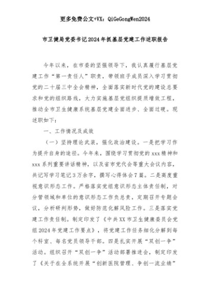 【七哥公文】2025年:市卫健局党委书记2024年抓基层党建工作述职报告+更多免费公文+VX:QiGeGongWen2024+更多免费公文+VX:QiGeGongWen2024