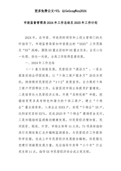 【七哥公文】2025年:市场监督管理局2024年工作总结及2025年工作计划+更多免费公文+VX:QiGeGongWen2024+更多免费公文+VX:QiGeGongWen2024