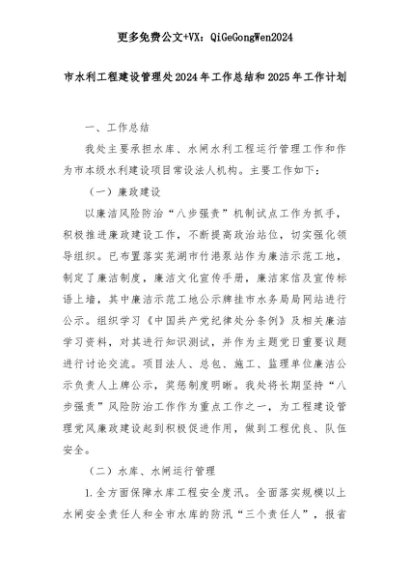 【七哥公文】2025年:市水利工程建设管理处2024年工作总结和2025年工作计划+更多免费公文+VX:QiGeGongWen2024+更多免费公文+VX:QiGeGongWen2024