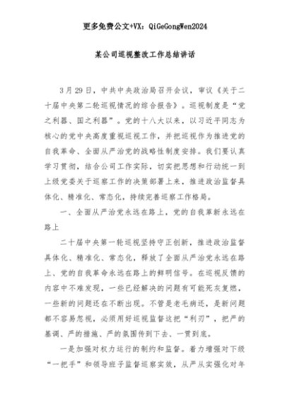 【七哥公文】2025年:某公司巡视整改工作总结讲话+更多免费公文+VX:QiGeGongWen2024+更多免费公文+VX:QiGeGongWen2024
