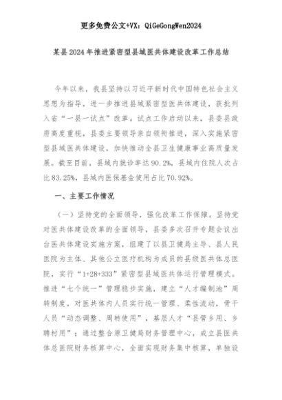 【七哥公文】2025年:某县2024年推进紧密型县域医共体建设改革工作总结+更多免费公文+VX:QiGeGongWen2024+更多免费公文+VX:QiGeGongWen2024