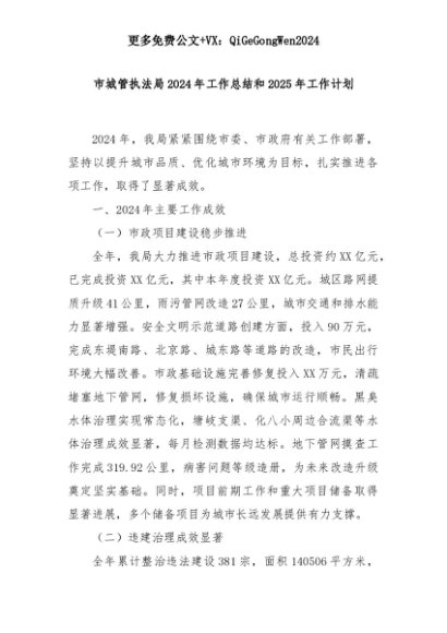 【七哥公文】2025年:市城管执法局2024年工作总结和2025年工作计划+更多免费公文+VX:QiGeGongWen2024+更多免费公文+VX:QiGeGongWen2024