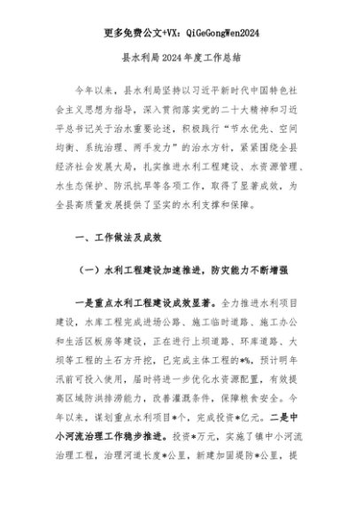 【七哥公文】2025年:县水利局2024年度工作总结+更多免费公文+VX:QiGeGongWen2024+更多免费公文+VX:QiGeGongWen2024