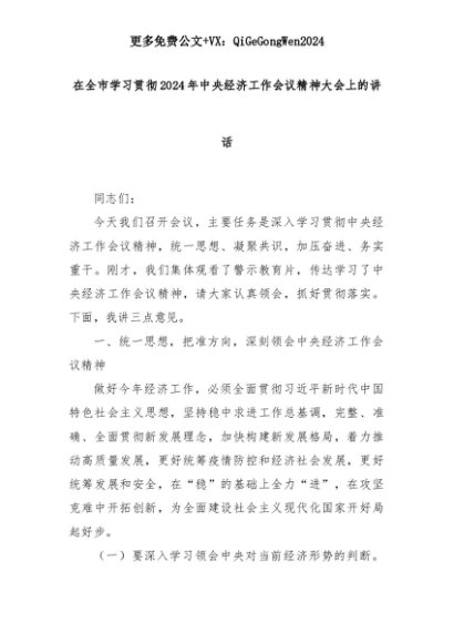 【七哥公文】2025年:在全市学习贯彻2024年中央经济工作会议精神大会上的讲话+更多免费公文+VX:QiGeGongWen2024+更多免费公文+VX:QiGeGongWen2024