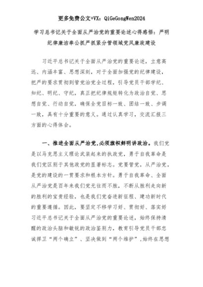 【七哥公文】2025年:学习总书记关于全面从严治党的重要论述心得感悟:严明纪律廉洁奉公抓严抓紧分管领域党风廉政建设+更多免费公文+VX:QiGeGongWen2024+更多免费公文+VX:QiGeGongWen2024