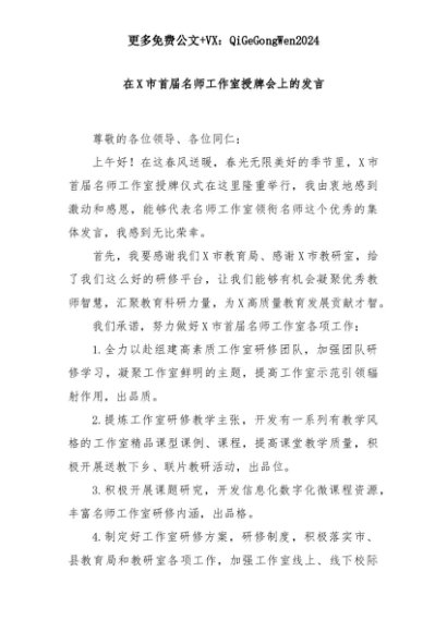 【七哥公文】2025年:在X市首届名师工作室授牌会上的发言+更多免费公文+VX:QiGeGongWen2024+更多免费公文+VX:QiGeGongWen2024