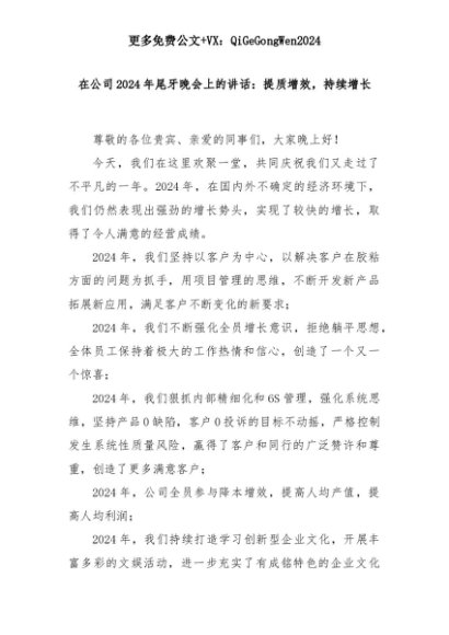 【七哥公文】2025年:在公司2024年尾牙晚会上的讲话:提质增效,持续增长+更多免费公文+VX:QiGeGongWen2024+更多免费公文+VX:QiGeGongWen2024