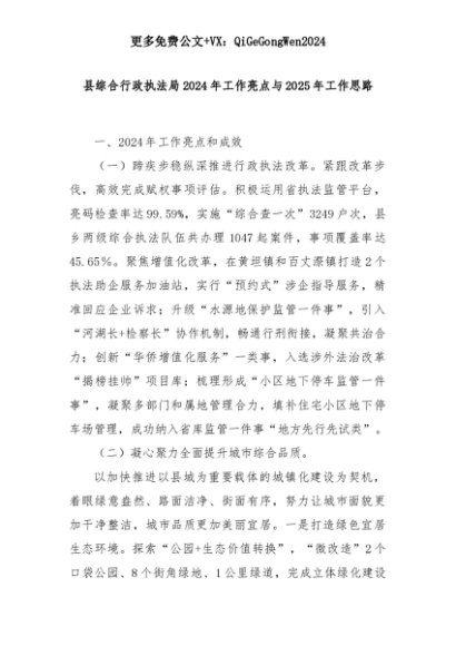 【七哥公文】2025年:县综合行政执法局2024年工作亮点与2025年工作思路+更多免费公文+VX:QiGeGongWen2024+更多免费公文+VX:QiGeGongWen2024