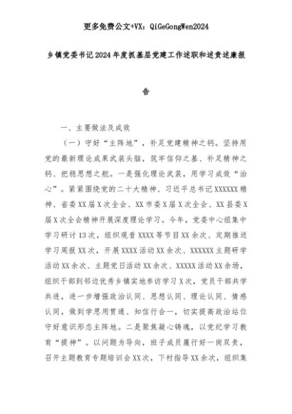 【七哥公文】2025年:乡镇党委书记2024年度抓基层党建工作述职和述责述廉报告+更多免费公文+VX:QiGeGongWen2024+更多免费公文+VX:QiGeGongWen2024