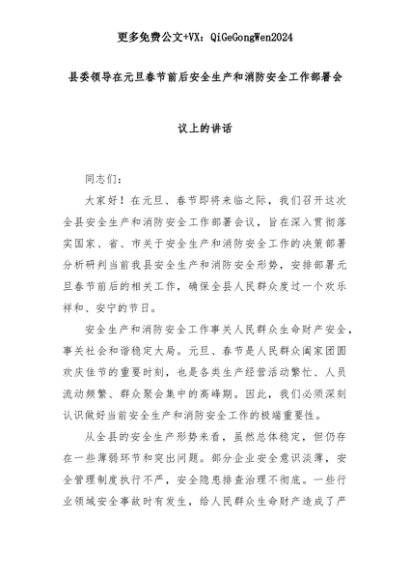 【七哥公文】2025年:县委领导在元旦春节前后安全生产和消防安全工作部署会议上的讲话+更多免费公文+VX:QiGeGongWen2024+更多免费公文+VX:QiGeGongWen2024