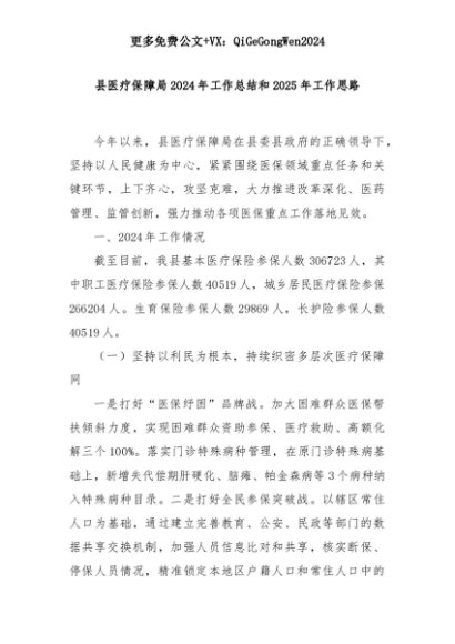 【七哥公文】2025年:县医疗保障局2024年工作总结和2025年工作思路+更多免费公文+VX:QiGeGongWen2024+更多免费公文+VX:QiGeGongWen2024