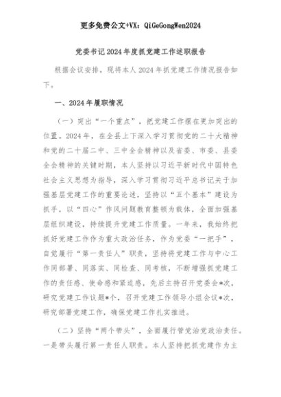 【七哥公文】2025年:党委书记2024年度抓党建工作述职报告+更多免费公文+VX:QiGeGongWen2024+更多免费公文+VX:QiGeGongWen2024