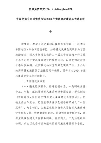 【七哥公文】2025年:中国电信分公司党委书记2024年党风廉政建设工作述职报告+更多免费公文+VX:QiGeGongWen2024+更多免费公文+VX:QiGeGongWen2024