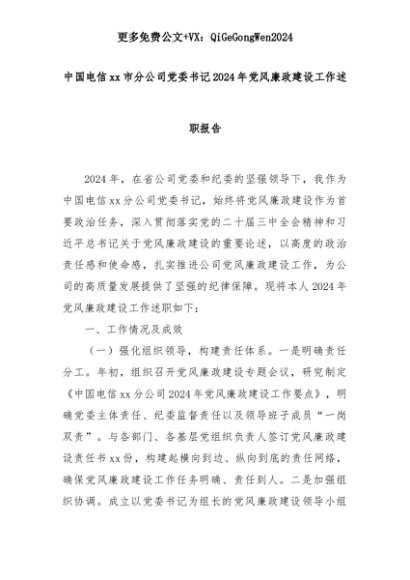 【七哥公文】2025年:中国电信xx市分公司党委书记2024年党风廉政建设工作述职报告+更多免费公文+VX:QiGeGongWen2024+更多免费公文+VX:QiGeGongWen2024