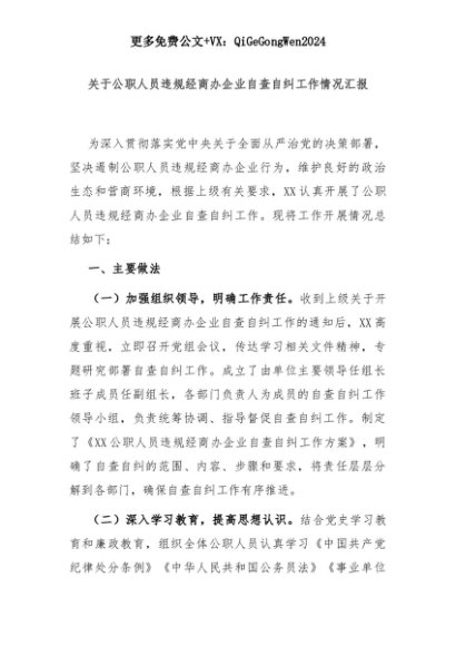 【七哥公文】2025年:关于公职人员违规经商办企业自查自纠工作情况汇报+更多免费公文+VX:QiGeGongWen2024+更多免费公文+VX:QiGeGongWen2024