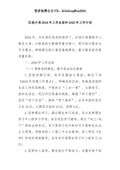 【七哥公文】2025年:区统计局2024年工作总结和2025年工作计划+更多免费公文+VX:QiGeGongWen2024+更多免费公文+VX:QiGeGongWen2024