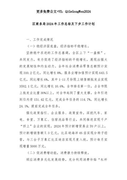 【七哥公文】2025年:区商务局2024年工作总结及下步工作计划+更多免费公文+VX:QiGeGongWen2024+更多免费公文+VX:QiGeGongWen2024