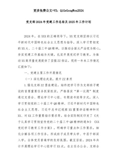 【七哥公文】2025年:党支部2024年党建工作总结及2025年工作计划+更多免费公文+VX:QiGeGongWen2024+更多免费公文+VX:QiGeGongWen2024