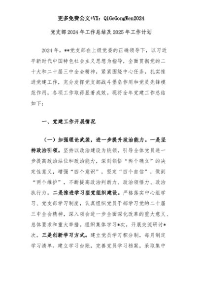 【七哥公文】2025年:党支部2024年工作总结及2025年工作计划+更多免费公文+VX:QiGeGongWen2024+更多免费公文+VX:QiGeGongWen2024