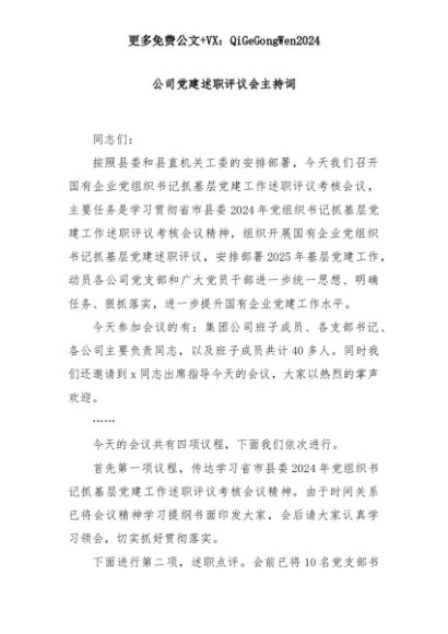 【七哥公文】2025年:公司党建述职评议会主持词+更多免费公文+VX:QiGeGongWen2024+更多免费公文+VX:QiGeGongWen2024