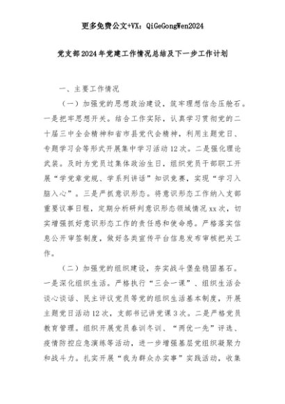 【七哥公文】2025年:党支部2024年党建工作情况总结及下一步工作计划+更多免费公文+VX:QiGeGongWen2024+更多免费公文+VX:QiGeGongWen2024