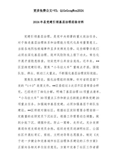 【七哥公文】2025年:2024年县党建引领基层治理经验材料+更多免费公文+VX:QiGeGongWen2024+更多免费公文+VX:QiGeGongWen2024