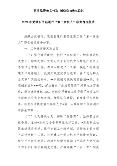【七哥公文】2025年:2024年党组织书记履行“第一责任人”职责情况报告+更多免费公文+VX:QiGeGongWen2024+更多免费公文+VX:QiGeGongWen2024