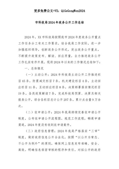【七哥公文】2025年:市科技局2024年政务公开工作总结+更多免费公文+VX:QiGeGongWen2024+更多免费公文+VX:QiGeGongWen2024