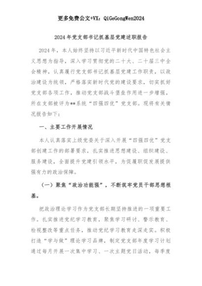 【七哥公文】2025年:2024年党支部书记抓基层党建述职报告+更多免费公文+VX:QiGeGongWen2024+更多免费公文+VX:QiGeGongWen2024