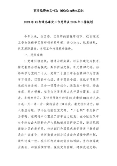 【七哥公文】2025年:2024年XX街道办事处工作总结及2025年工作规划+更多免费公文+VX:QiGeGongWen2024+更多免费公文+VX:QiGeGongWen2024