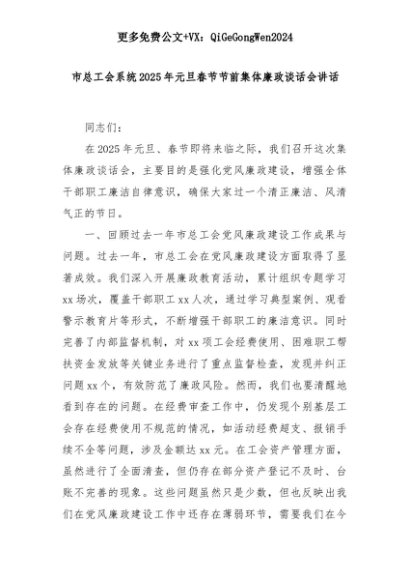 【七哥公文】2025年:市总工会系统2025年元旦春节节前集体廉政谈话会讲话+更多免费公文+VX:QiGeGongWen2024+更多免费公文+VX:QiGeGongWen2024